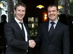 On October 1, 2012, Zuckerberg met with then-Russian Prime Minister Dmitry Medvedev in Moscow to stimulate social media innovation in Russia and to boost Facebook's position in the Russian market.[45][46] Russia's communications minister tweeted that Medvedev persuaded Zuckerberg to open a research center in Moscow instead of trying to lure away Russian programmers. In 2012, Facebook had roughly 9 million users in Russia, while domestic clone VK had around 34 million.[47][48] Rebecca Van Dyck, Facebook's head of consumer marketing, said that 85 million American Facebook users were exposed to the first day of the Home promotional campaign on April 6, 2013.[49]