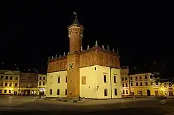 The Market Square remains Tarnów's most prominent public space, part of the downtown urban layout listed in the register of monuments.[5] The historic town hall stands at its center, surrounded by tenements built between the 16th and 19th centuries. The most significant are the Renaissance arcaded tenements in the northern row.[6] Every day at noon, the Tarnów hymn, composed by Stanisław Rzepecki, is played from the town hall tower.[7][8]
