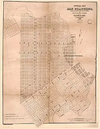 The official map of San Francisco (1849), as surveyed by Jasper O'Farrell in 1847. Market Street is the prominent dividing line between the north-south grid laid by Jean Jacques Vioget and the grid of Happy Valley aligned with Mission Street.