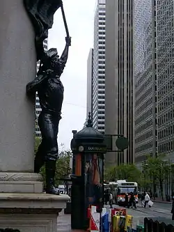 Another view of Market Street in downtown San Francisco, taken near the intersection with Montgomery Street, looking northeast toward the Ferry Building. The foreground bronze is entitled Admission Day, by Douglas Tilden.