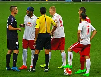 Ahead of the 2015 season, it was announced that Rosenberg was the new captain for Malmö FF, succeeding Molins.[285] Rosenberg started the season well scoring two goals in the four Svenska Cupen matches.[286][287] In a 4–1 win against GIF Sundsvall in the opening game of the season, he scored and set up the club's second goal of the game.[288] Having been linked a move away from Malmö FF earlier in the season, Rosenberg put the transfer rumours aside when he signed a contract extension with the side, keeping him until 2017.[289][290] From the start of the 2015 season, Rosenberg retained his first team place as well as his captaincy of the side.[291][292][293][294][295] He only scored two goals in the next three months, which came against Hammarby on 20 April 2015 and another came against Åtvidaberg on 31 May 2015.[296][297] Between mid–July and August, Rosenberg began a goal scoring spree, adding eight goals to his tally.[298][299][300][301][302] One of the goals came in Malmö's 3–0 return leg win over Red Bull Salzburg in the third qualifying round for the 2015–16 UEFA Champions League on 5 August 2015.[303] Thanks to an aggregate score of 3–2, Malmö eliminated Salzburg for the second successive season, contributing to Salzburg's run of eight unsuccessful attempts to qualify for the Champions League since being purchased by the Red Bull company in 2005.[304][305] In their home match on 25 August 2015, Rosenberg scored the first goal as Malmö defeated Celtic 2–0, winning 4–3 on aggregate and thereby qualifying for the Champions League group stage for the second consecutive year.[306][307] He later scored four more goals later in the 2015 season, including a brace against Kalmar on 17 October 2015.[308][309][310] After serving a one-match suspension, Rosenberg returned to the starting line-up in the last game of the season against IFK Norrköping, only to be sent off in the 5th minute of the match, as Malmö lost 2–0.[311][312] Malmö FF were unable to follow up their success in European qualifying with a league title in 2015, disappointingly finishing in fifth place.[313][314] Having been out of the first team on three occasions during the 2015 season,[315][316][317] Rosenberg finished the season with 42 appearances and 16 goals in all competitions.