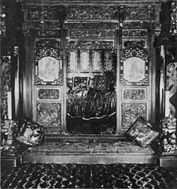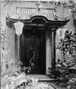The mansion also featured a Chinese temple room which reconstructed a 5th-century Chinese temple and included a more-than-500-year-old mandarin bed which had once belonged to a Chinese princess. The Chinese temple room was said to have cost $87,000.[3][6][7][8] In the mansion, Marshall built nautical-themed bar which featured portholes with a moving replica of the sea which mimicked rocking of a boat at sea. This space would inspire a bar which Marshall would later design for the Edgewater Beach Hotel. The mansion also featured a reconstructed room taken from a convent. The mansion also included a small cafe room with a table which bore the autographs of many of the prominent visitors to the mansion.[7] The mansion also contained a studio/drawing room.[8][6] This space featured a high ceiling and a stage. Underneath the stage was storage space for tables which could be rolled out in order to transform the architecture studio workspace into a banquet hall.[8] Serving as a backdrop curtain to the stage was a tapestry which Louis XIV once presented to Madame de Pompadour.[6] The home also housed an architectural studio and office for Marshall when he lived there, which was housed in its street-facing front side.[6]