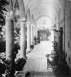 The residence is one of the most extravagant residences ever built in the history of the North Shore suburbs of Chicago.[3][5] The mansion's Spanish Colonial Revival exterior was somewhat simple, but the interior spaces and furnishings were immensely elaborate.[6] The construction utilized concrete and steel. The mansion's interior featured hollow concrete columns which were polished in a manner to extremely convincingly mimic the appearance of marble.[7] The mansion was built into a bluff so that only one of its three stories was visible at street level on its front.[3] It was said to have cost somewhere between $500,000 and $1,000,000 to construct.[3][6] Wilmette building permit records show that, in the years between its initial competition and its demolition, a further $113,000 of construction would be invested in the structure.[8] The mansion was located along Sheridan Road on the south side of Wilmette Harbor along a bluff.[2][3][9] Located on the east side of Sheridan Road, it stood across the road from the North American Baháʼí House of Worship.[7][6] It was located at a curve in Sheridan Road near where the road crosses over the end of the North Shore Channel.[1] Its street address was 612 Sheridan Road.[10] The mansion became a well-known location,[11] making it an unofficial landmark until it was torn down.[8] In 1925, the Chicago Tribune hailed it as, "one of the sights of Chicago".[12]