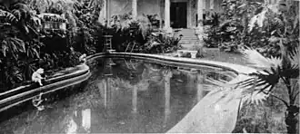The mansion featured an enclosed tropical greenhouse featuring an indoor swimming pool[3][6] with turquoise blue colored tiling.[6] This greenhouse was a main space of the mansion, with the mansion's other rooms effectively wrapping around it.[6] In the greenhouse, the pool was surrounded by tropical garden complete with palm trees. When he was furnishing the garden, Marshall commissioned a five-car train in order to transport to Wilmette the tropical plants for the greenhouse. The steel-framed greenhouse featured glass windows along its exterior which could be opened in the summer weather to open the greenhouse space up to the outdoors. These windows would automatically open at the push of a button.[7][14] The greenhouse's tropical garden was inhabited by live monkeys.[14]