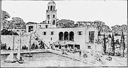In 1921, Benjamin Marshall unveiled his plans to construct a palatial mansion to house his personal residence, his studio, as well as a quarters for the Sheridan Shores Club membership organization. The mansion would replace a temporary studio he had constructed on property he had overlooking Wilmette Harbor. A June 26, 1921 Chicago Tribune article wrote that the planned "elaborate Spanish-American type of building of pink stucco," would house, "one of the most elaborate and luxurious studios in the country." The original at that time was to feature a red tiled roof and a fifty-foot tower.[1] Construction on a final design of the forty-room pink-stucco Spanish Colonial Revival was started that year and was completed in 1924.[2][3][4]