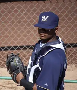 He spent his first six seasons as a backup catcher in Milwaukee.[69] Maldonado's throwing arm has attracted praise, as he dispatched 19 of 48 would-be basestealers during the 2021 season, the fourth-best caught-stealing percentage in the league. When it came to his framing, however, he has been rated a below-average pitch framer; in October 2020 Fangraphs rated him -2.1 in framing, worse than the average catcher, and Baseball Savant rated him the 38th percentile of MLB catchers in framing.[70] Primarily known for his defense and pitch-calling, as of 2021 he had not hit well in his career (.290 on-base percentage).[71][13]