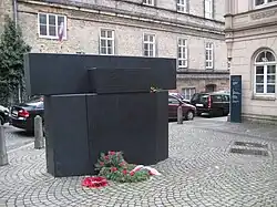 Also in 1982, not far from this former main synagogue of the Jewish community in Bremen the Memorial for the Victims of Reichskristallnacht was installed in front of the Landherrnamt building, in memory of Martha and Adolph Goldberg and the other three Jewish victims of Reichspogromnacht in Bremen and the surrounding area. The memorial was created according to a plan by Hans D. Voss, an informalist artist from Bremen. It is rendered in unadorned, cubic blocks of died-black concrete, and bears a commemorative plaque, with the inscription shown below in translation:[16]