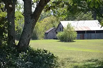 The corn crib is the small building at the center of this picture, partially obscured by the barn to the right. | |