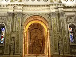 - On the side of the tabernacle (west side): "He also converts some people in Spain, in Jerusalem he is condemned to death. He is the first of the Apostles that bears witness to Jesus with his blood." (Latin: "In Hispania aliquos convertit, Jerosolymae capite damnatus est. Primus apostolorum profuso sanguine testimonium Jesu dedit.")