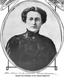 Sherman joined the Chicago Woman's Club on advice from her mother-in-law, already a member. She joined a women's study group on parliamentary law that sparked an ongoing interest in the subject.[2] Soon she was using her new expertise while serving as an officer in women's organizations, including the Chicago Woman's Club, the Illinois Federation of Women's Clubs, and the General Federation of Women's Clubs.[3] She held the position of recording secretary in the national organization from 1904 to 1908, then became vice president at the national level, from 1908 to 1910. She also published a book on parliamentary law, Parliamentary Law at a Glance: A Guide for Club Women and Students (1901), and taught at John Marshall Law School in Chicago.[4] In 1907, she toured the Panama Canal Zone with Federation president Eva Perry Moore.[5]