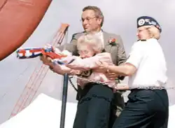 Officials assist Leila Sears, Mary's sister, as she christens the Navy's newest research vessel: USNS Mary Sears. (Photo courtesy of US Navy)
