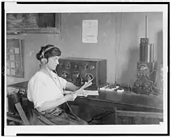 ![]() Mary T. Loomis, seated, with her radio apparatus in the Loomis Radio College, Washington, DC. | |