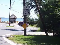 East of Jacobsville, MD 177 received the eastern end of MD 100. There is no direct access from eastbound MD 100 to westbound MD 177. The state highway becomes a three-lane road with the reversible center lane controlled by lane use signals. During rush hours, there are two lanes in the relevant direction; at all other times, the center lane serves as a center left-turn lane. The eastern end of the three-lane section is at South Carolina Avenue in the community of Lake Shore. MD 177 continues east as a two-lane undivided road and passes a loop of Old Mountain Road before heading south of Chesapeake High School. At Pinehurst Road, which leads to Downs Memorial Park, the route veers southeast toward Gibson Island. MD 177 reaches its eastern terminus at the gatehouse that guards the private island community on the north side of the mouth of the Magothy River at the Chesapeake Bay.[1][2]