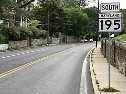 Maryland Route 195 (MD 195) is a state highway in the U.S. state of Maryland. Known as Carroll Avenue, the state highway runs 1.90 miles (3.06 km) from Eastern Avenue at the District of Columbia boundary in Takoma Park north to MD 193 in Silver Spring. MD 195 is the main northeast–southwest state highway through Takoma Park in southeastern Montgomery County. The highway provides access to Washington Adventist University and Washington Adventist Hospital and crosses Sligo Creek on the Carroll Avenue Bridge. The state highway was built from Washington, D.C., to Silver Spring in the late 1920s on a road that has existed since the 19th century. The bridge, built in 1932, is the third at the site; it was rebuilt from in 2015 to 2017.[2]