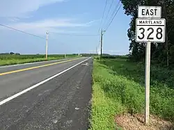 Maryland Route 328 (MD 328) is a state highway in the U.S. state of Maryland. The state highway runs 15.24 mi (24.53 km) from U.S. Route 50 (US 50) in Easton east to just north of MD 404 in West Denton. MD 328 connects Easton with Denton, passing through eastern Talbot County and a neck of land in Caroline County between the Choptank River and Tuckahoe Creek. MD 328 was constructed in Talbot County in the late 1910s between downtown Easton and a point west of Matthews. The state highway was constructed in Caroline County in the late 1920s and early 1930s, and was originally designated MD 457. The gap between the two highways was filled in the late 1940s and included a modern bridge over Tuckahoe Creek. MD 328's western terminus was moved to US 50 in the early 1960s. In West Denton, the highway was relocated and extended north to present MD 404 in the early 1980s.