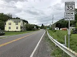 MD 35 was constructed in the late 1910s and was one of the original signed state highways in 1927. The state highway runs through the valley of Wills Creek, an important passage for the railroads beginning in the mid 19th century.