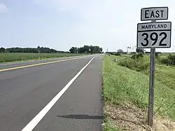 Maryland Route 392 (MD 392) is a state highway in the U.S. state of Maryland. The state highway runs 13.54 miles (21.79 km) from MD 16 in East New Market east to the Delaware state line at Reliance, where the highway continues east as Delaware Route 20 (DE 20). MD 392 connects East New Market with Hurlock as well as Seaford, Delaware, via DE 20. The state highway was constructed from Finchville to Reliance in the early 1930s. MD 392 was extended west to Hurlock in 1951 and to East New Market in 1957.