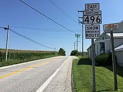 Maryland Route 496 (MD 496) is a state highway in the U.S. state of Maryland. Known as Bachmans Valley Road, the state highway runs 7.23 miles (11.64 km) from MD 97 near Pleasant Valley east to MD 30 in Melrose. MD 496 was constructed from Pleasant Valley to Bachman Mills in the mid-1930s. The state highway was completed to Melrose in the late 1940s.