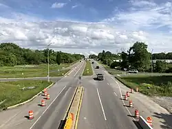 MD 68 was relocated south of Williamsport, replacing Sunset Avenue and what is now Kendle Road, in 1965.[14] The state highway was relocated for a grade separation of the Cumberland Valley Railroad and to tie into an interchange with I-81 and the south end of Conococheague Street.[14][15] MD 63 joined MD 68 in a concurrency along Conococheague Street north to US 11.[14] The new alignment of MD 68 and MD 63 was built as a four-lane divided highway around the interchange with I-81, which originally only contained ramps to and from the direction of West Virginia when the interchange opened with the completion of I-81 in 1966.[16] That interchange was completed with ramps to and from Hagerstown between 1981 and 1989.[17][18] Since the completion of I-68 in 1991, the Interstate and state-numbered highways with the same number have co-existed separated by 17 miles (27 km) on I-70.[1][19] Multiple signs on westbound I-70 in advance of the Interstate's interchange with MD 68 advise motorists that I-68 and MD 68 are not the same highway and remind them to remain on I-70 to access I-68.[20]