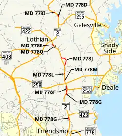 - MD 778J is a 0.95-mile (1.53 km) loop and spur located on the northbound side of MD 2 north of Nutwell Road between Tracys Landing and Lothian. There is a connection between MD 2 and MD 778J a short distance south of the northern terminus.[1][22] This segment of Old Solomons Island Road was bypassed in 1963.[15]