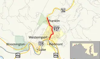 Maryland Route 937 (MD 937) is an unsigned state highway in the U.S. state of Maryland. The state highway runs 1.53 miles (2.46 km) from MD 135 north to MD 36 within Westernport. MD 937 is the old alignment of MD 36 through Westernport in the Georges Creek Valley of western Allegany County. The state highway was designated when MD 36 moved to a new alignment through the community in the early 1980s.