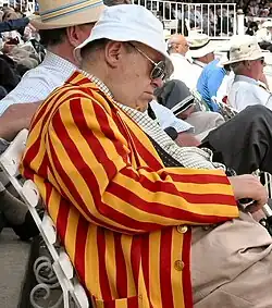 The true provenance of MCC's colours is (and probably will remain) unsubstantiated, but its players often turned out sporting sky blue (qv. Eton or Cambridge) until well into the 19th century. The club eventually settled on the now well-recognised colours of scarlet and gold,[35][36] or in other parlance "egg and bacon".[37] One purported theory is that MCC adopted these colours from J&W Nicholson & Co's gin after the company's chairman, MCC benefactor William Nicholson (1825–1909), secured the club's position at Lord's with a loan.[38] A more likely theory, which chimes with the club's origins, is that MCC borrowed its colours from the livery colours (racing) of a founding patron, the Duke of Richmond, Lennox and Gordon, of Goodwood-fame.