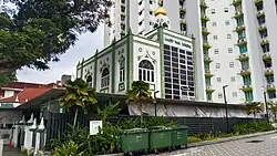 Formerly a simple wooden surau, the present day mosque is a two-storey concrete building, designed by Singaporean architectural firm, Akitek Yeokhoo.[3] The mosque is built in a mixture of styles that combine Indo-Saracenic architecture and traditional Malay architecture.[4] A golden, glided onion dome tops the entrance to the female prayer hall.