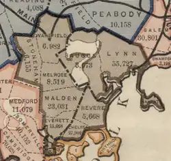 1893: "Essex County: Towns of Lynn, Nahant, and Saugus. Middlesex County: Towns of Everett, Malden, Melrose, Stoneham, and Wakefield. Suffolk County: 4th and 5th wards of the city of Boston, and the towns of Chelsea and Revere."[10]