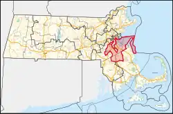 2013–2023![]() In Bristol County: Precincts 1 and 2 in Raynham. In Norfolk County: Avon, Braintree, Canton, Cohasset, Dedham, Holbrook, Milton:Precincts 2–4, and 6–9, Norwood, Quincy, Randolph, Stoughton, Walpole, Westwood, and Weymouth. In Plymouth County: Abington, Bridgewater, Brockton, East Bridgewater, Hingham, Hull, Scituate, West Bridgewater, and Whitman. In Suffolk County: Boston, Ward 3: Precincts 1–6; Ward 5: Precincts 3–5, 11; Ward 6, Ward 7: Precincts 1–9, Ward 11: Precincts 9 and 10, Ward 13: Precincts 3, 7, and 10, Ward 16: Precincts 2, 5, 7, 9, 10, and 12, Ward 19: Precincts 1–6, 8, and 9, and Ward 20: Precincts 1, 2, and 4–20. |