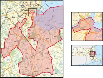 | 1993–2003 Belmont, Boston (Wards 1, 2, 4, 5, 9, 10, 11, 12, 14, 15, 17, 18, 21, 22), Cambridge, Chelsea, Somerville, Watertown.[15] | |||||