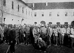 Photograph of Albanian prisoners in front of the Kumanovo Municipality building after the Battle of Kumanovo