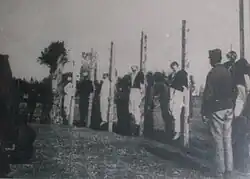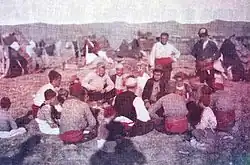 In Tirana, many Albanians were beaten to death by local Serbian troops.[51] After aiding Albanian volunteers, residents of Kaza Tirana had their houses burnt down and 17 people burned to death and an additional 12 were executed.[3] According to Jovan Hadži Vasiljević, in his book “Arnauti naše krvi-Arnautaši", published in Belgrade in 1939, in the village of Brut, near the Drin river, Serbian troops had ordered the local Albanian villagers to bring them food. After the villagers delivered the food, they were murdered, and their heads were cut off and placed at the feet of dead Serbian troopers.[52] In 1913, Serbian troops entered Albanian inhabited villages and bayonetted 27 unarmed men from the village of Gjuzaj when they resisted the occupation.[53] Serbian troops also committed several atrocities in the village of Kadiaj in Fier.