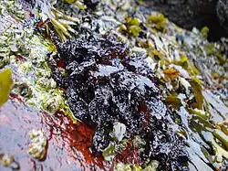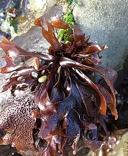 Mastocarpus papillatus, sometimes called Turkish washcloth, black tar spot,[4] or grapestone[5] is a species of red algae in the family Phyllophoraceae. It is sometimes confused with the distantly related Turkish towel (Chondracanthus exasperatus) which is of a similar texture but larger. The specific epithet papillatus ('with papillae')[6] is due to the nipple-like projections on the female gametophyte which can give the texture of a terrycloth washcloth found at a Turkish bath.[4]