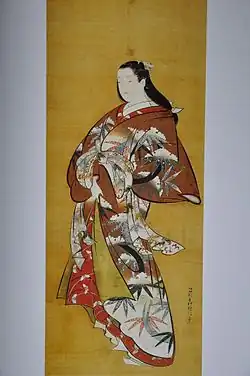 Matsuno Chikanobu (松野親信, fl. 1720s) was a Japanese painter of the Kaigetsudō school of ukiyo-e art. Believed to be one of the most popular painters of his time, his work, very much in the Kaigetsudō style, consists largely of bijin-ga (pictures of beautiful ladies) and features bright colors and exquisite kimono fashions.