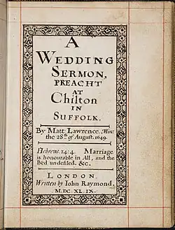 The William Andrews Clark Memorial Library, part of the University of California, Los Angeles has a unique manuscript of a sermon preached by Matthew Lawrence.[2] The sermon was delivered at the marriage ceremony of Anne Crane, the daughter of Sir Robert Crane, 1st Baronet to Sir William Armine, 2nd Baronet on 28 August 1649 in St Mary's Church Chilton, Suffolk. The handwritten book, which mimics the style of a printed book, was produced by John Raymond and was sponsored by Lawrence as a gift for the groom's father, Sir William Armine, 1st Baronet, who had requested a copy. He had been a patron of Matthew Lawrence for many years. The book was previously owned by the antiquarian, John Eglington Bailey and the designer, Richard Harding Watt.[4]