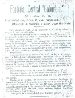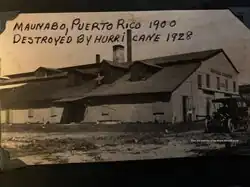 In the wake of Hurricane San Ciriaco which destroyed the plantations in 1899 the owners of the three largest plantations decided to combine forces and develop a modern sugar factory, The Central Columbia Sugar Company [6] (1901-1929). The factory site was 6.2 acres and located alongside the Maunabo River on land ceded to the new company by the Hacienda Garonne. Opened fully for business in 1901 the factory's first harvest was 20,000 sacks of sugar, the fifth highest total in the island. Thereafter the Columbia was a medium sized factory that served as an economic focal point for Maunabo but its growth was constrained by geography. Small and medium sized colonos were responsible for transporting clean sugars to the factory and paid a 5% charge for processing. The Central Columbia was destroyed by Hurricane Felipe on September 13, 1928 and thereafter the Maunabo sugars were processed at the Central Lafayette in Arroyo.[7] The site of the factory was used as a trucking way station—the first large scale trucking operation in the Puerto Rican sugar industry—by the C& J Fantauzzi Company. After the sale of the factory and related lands to the Puerto Rican government in 1936, the site continued to be used as a way station for Maunabo sugar producers until 1974.[8] Today the ruins of the Central Columbia are a notable landmark in Maunabo.