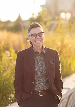 Growing up, Bradley most identified with the label androgynous, finding that they did not fit into the typical categories of male or female.[4][7] In their 20s, Bradley identified as third gender, as that was the current term to describe people outside of the gender binary.[4] In Queer Across Canada (1993), Bradley depicted how different regions of Canada use conflicting language to describe Bradley's gender identity and sexual orientation, becoming the first person to come out as queer on Canadian network TV.[8][4]