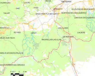 Maureillas-las-Illas is located in the canton of Vallespir-Albères and in the arrondissement of Céret. It lies east of Céret and north of the Spanish border.