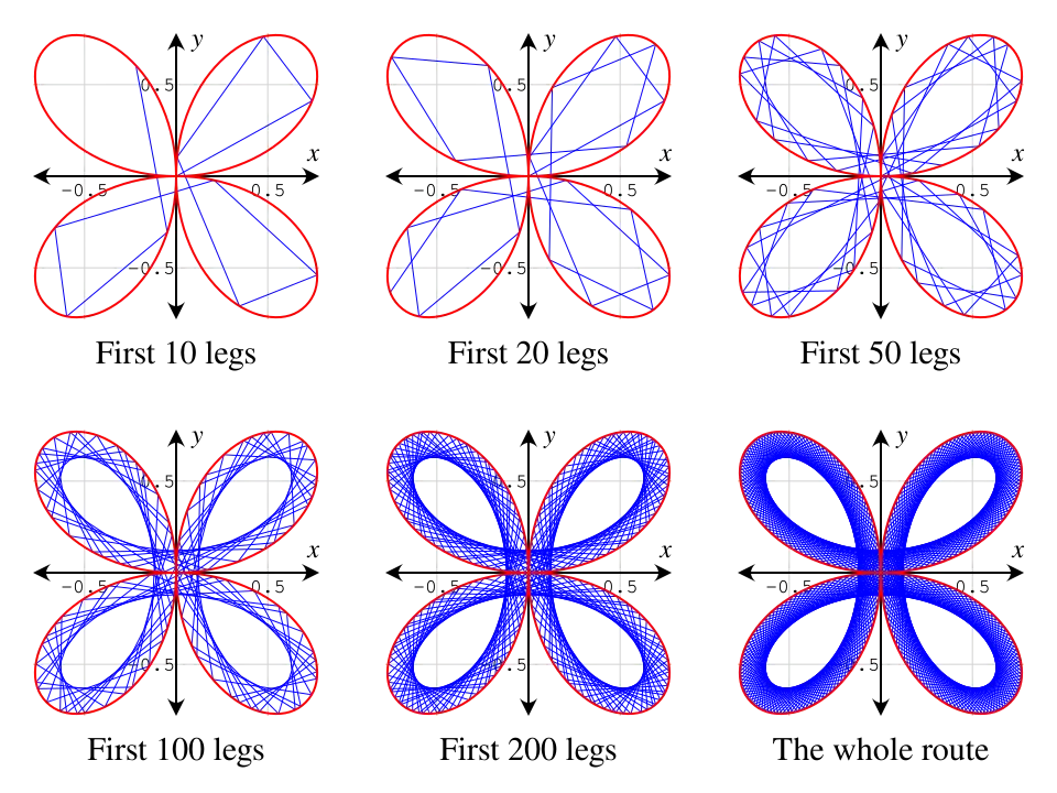 A Maurer rose can be described as a closed route in the polar plane. A walker starts a journey from the origin, (0, 0), and walks along a line to the point (sin(nd), d). Then, in the second leg of the journey, the walker walks along a line to the next point, (sin(n·2d), 2d), and so on. Finally, in the final leg of the journey, the walker walks along a line, from (sin(n·359d), 359d) to the ending point, (sin(n·360d), 360d). The whole route is the Maurer rose of the rose r = sin(). A Maurer rose is a closed curve since the starting point, (0, 0) and the ending point, (sin(n·360d), 360d), coincide.