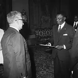In 1964, Gouandjia was designated as the Secretary General of Union générale des travailleurs centrafricains (General Union of Central African Workers; UGTC) after the Movement for the Social Evolution of Black Africa's convention in Berbérati stipulating the establishment of sole Central African trade union.[1] He also served as the technical director of the Central African Federation of Unions of Public Servants. As a secretary general of the worker union, he threatened to conduct a general strike in 1965.[2] In 1966, he was arrested following a strike and was released from imprisonment a few months later.[3] Bokassa appointed Gouandjia as the board of the Central African Order of Labor Council in January 1967.[1]