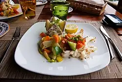 The most common vegetables used in Mauritian cuisine are tomatoes, onions, lalo (okra), brinzel (eggplants), chou chou (chayote), lay (garlic) and pima (chillies).[2] Rice and seafoods including salted fish, smoked blue marlin, shrimp, octopus, prawns, and crayfish (called "camaron") are also staple ingredients used in Mauritian cuisine.[3][8][1]
