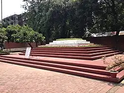 The foundation stone of the project to convert Kazi Nazrul Islam's tomb area into a mausoleum was laid on 25 May 1999 and the mausoleum was inaugurated on 27 August 2009 by Prime Minister Sheikh Hasina ten years later.[5] On 16 February 2011, two persons named Jaynath Nandi and Debashish Bhattacharya from West Bengal traveled to Bangladesh on a bicycle with soil from the grave of Kazi Nazrul Islam's wife Pramila Kazi located in Churulia. On 28 February, they placed that soil on the grave of Kazi Nazrul Islam.[6] The mausoleum complex, designed by Muzharul Islam, covers the tombs of Kazi Nazrul Islam, Zainul Abedin, Quamrul Hassan, Muzaffar Ahmed Chowdhury and Abdul Matin Chowdhury.[7]