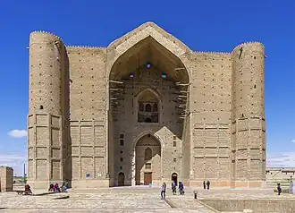 The town of Yasi was largely spared during the Mongol invasion of Khwarezmia in the 13th century.[12] Over time, the descendants of the Mongols settled in the area and converted to Islam.[1] The town then came under the control of the Timurid dynasty in the 1360s.[3] Timur (Tamerlane), the founder of the dynasty, expanded the empire's realm to include Mesopotamia, Iran, and all of Transoxiana, with its capital located in Samarkand.[3] To gain the support of local citizens, Timur adopted the policy of constructing monumental public and cult buildings.[12] In Yasi, he put his attention to the construction of a larger mausoleum to house Yasawi's remains,[13][14] with the intention of glorifying Islam, promoting its further dissemination, and improving the governance of the immediate areas.[14]