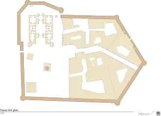 Remains of medieval structures such as other mausoleums, mosques and bath houses characterize the archaeological area.[3] To the north of the Mausoleum of Khawaja Ahmed Yasawi, a reconstructed section of the citadel wall from the 1970s separates the historical area from the developments of the modern town.[3]