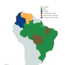 The distribution of Maxillaria aureoglobula is not well known due to its relatively recent classification. What is known is from the seven collected plants documented in literature. In Brazil three plants have been reported, one in the state of Maranhão[4] and two in the state Mato Grosso.[3] Two plants in Venezuela were incorrectly documented as Maxillaria rufescens by Dunsterville and Gray in 1961[6][2] one plant in the Municipality of Maracay in the state of Aragua the other was found in Municipality of Guatopo in the state of Miranda.[6][4] The type specimen was a plant in cultivation with an unknown locality in Colombia.[2] In 2016 Sauleda reported on a specimen that was found in the municipality of Darién in the state of Chohó.[7] This plant gave a documented locality in Colombia.