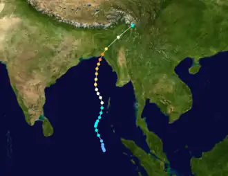 On May 13, a near-equatorial trough developed. The poorly organized system slowly tracked towards the north-northwest. The following day, deep convection consolidated around the center of circulation and the Joint Typhoon Warning Center (JTWC) classified the system as Tropical Cyclone 01B.[1] On May 15, the India Meteorological Department (IMD) also began monitoring the system; however, they classified it as Depression BOB 01.[2] Favorable upper-level conditions and good outflow allowed the storm to intensify. Shortly after, the cyclone attained tropical storm-force winds and turned towards the northeast. While gradually increasing in forward motion, the storm continued to strengthen.[1] The IMD eventually upgraded the system to a cyclonic storm on May 16.[2]