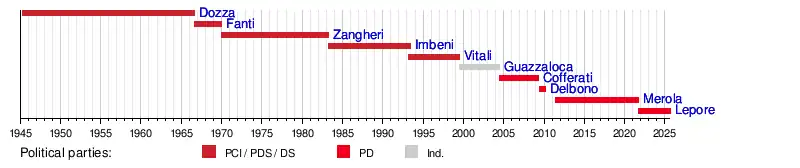 | Mayor of Bologna | Term start | Term end | Party | Coalition | Election | ||