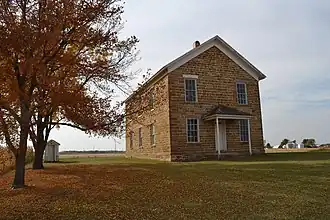 The Maysville Schoolhouse is a historic building located south of Hampton, Iowa, United States. The former school building is the only structure left from the defunct town of Maysville, the first town established in Franklin County.[2] It was platted in 1865, and it was located on the stage line between Ackley and Hampton. Many merchants and professional moved into the community. This two-story, vernacular stone structure was built for $5,000 in 1867 by James Carn as a combination schoolhouse and meeting hall. The citizens of Maysville hoped that their community would be chosen as the county seat, but in 1872 the railroad went north to Hampton. In the 1880s the businessmen and professionals moved out, and the post office closed in 1890. By the turn of the 20th-century Maysville had become a ghost town. The school remained in operation until 1957, but the second floor hall continued to be used by various community organizations and the Methodist Church. The building was listed on the National Register of Historic Places in 1981.[1]