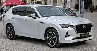The Mazda CX-60 is a mid-size crossover SUV produced by the Japanese automobile manufacturer Mazda since 2022. It is the first vehicle to use Mazda's rear- and all-wheel drive platform with longitudinal engine layout categorised as Large Product Group, which includes a line-up of straight-six engines. It is also the first Mazda vehicle to feature a plug-in hybrid option.[6]