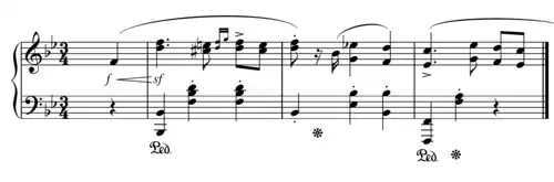 The piece starts with a bold theme, characterized by thirds and sixths. It is soon followed by a section in question and answer, which is then completed with a descending sequence. This main theme is repeated twice more with slight modulations. The brief and slower middle section, in E-flat major, has a syncopated rhythm and is subdued in its grace and mystery, providing a calmer atmosphere. Soon, the main theme returns and after being repeated twice again, the mazurka ends boldly with a B-flat major chord in octaves. Overall, the mazurka is full of vigor and joy with an aristocratic air about it.[2][3]